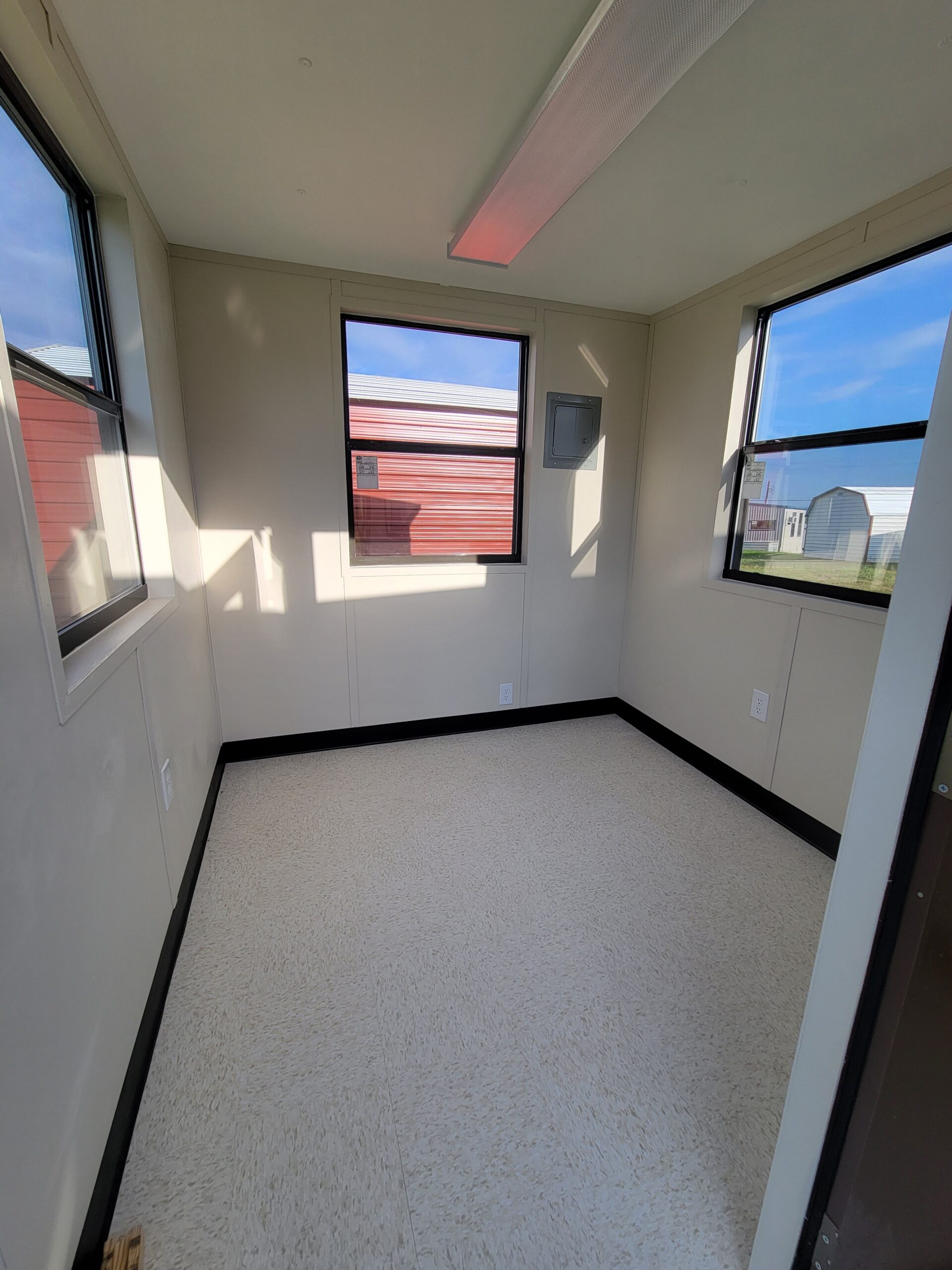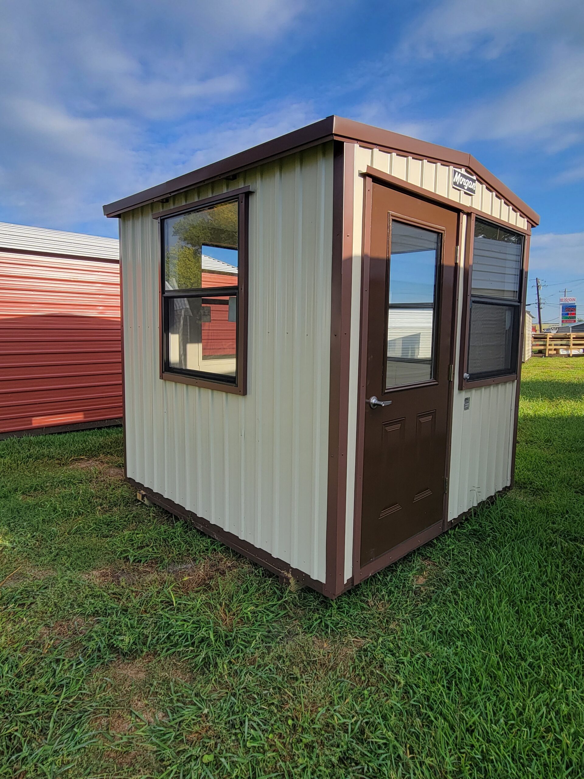 8×8 Guardhouse with 4 windows, a single door and 7′ studs. Building is set up for electrical. Building has light stone siding with koko brown trim.  Includes 8,000 BTU HVAC