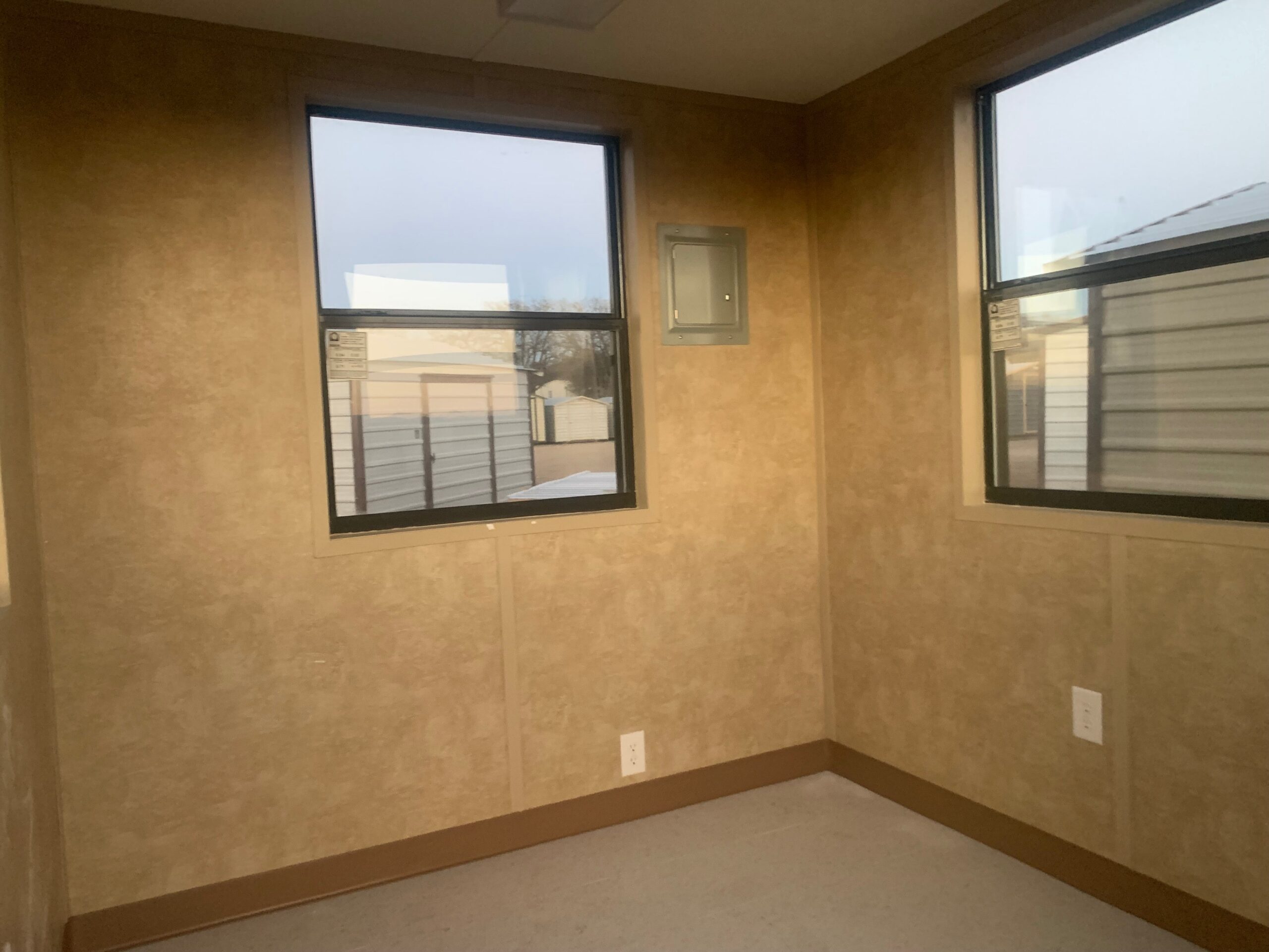 8×8 Finished Peak-Style Guard House/ OfficeSteel Half Glass Door & 4 WindowsElectrical and InsulationAlmond Siding w/ Brown Trim