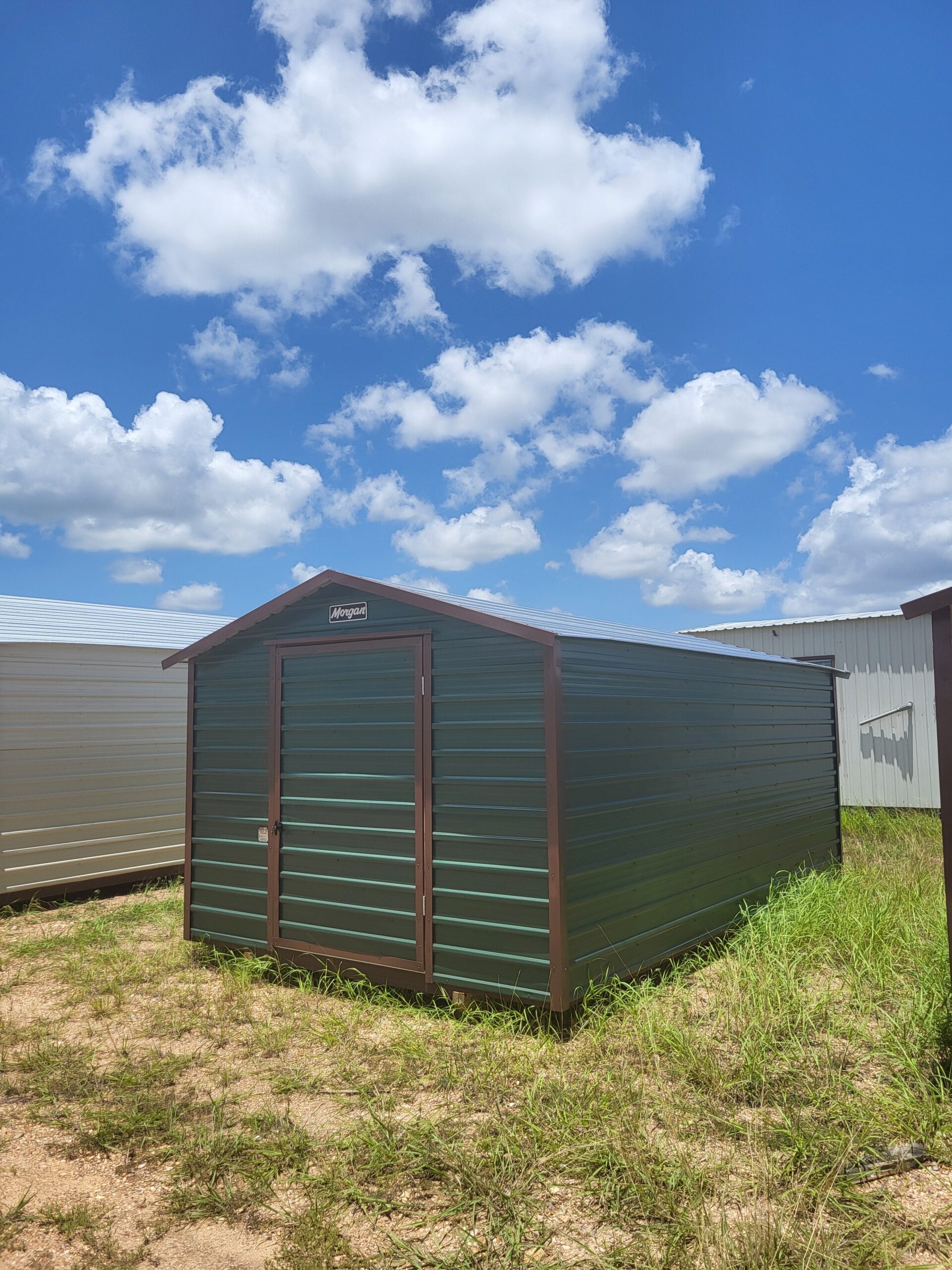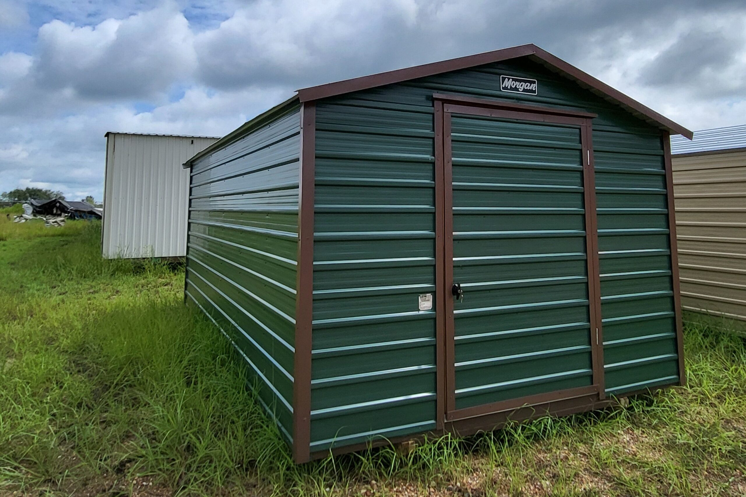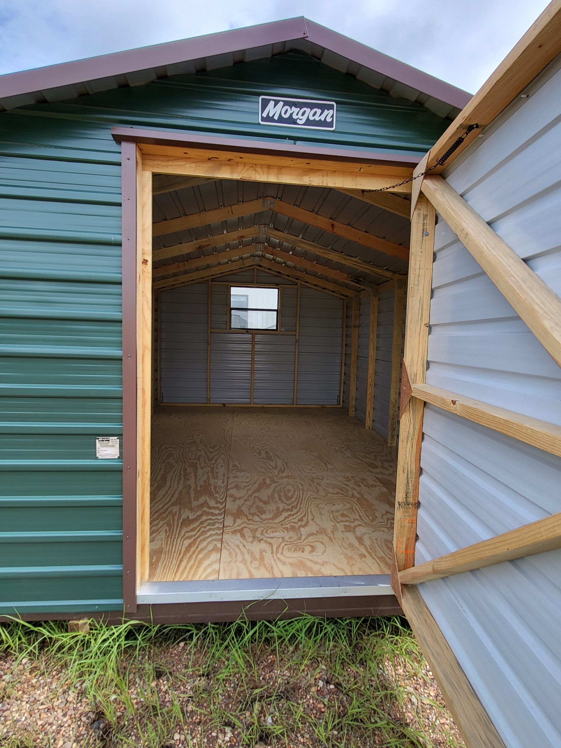 Classic Forest Green/Brown Trim Steel Shed with Single End Door, Window on Back Wall, and 6′ Studs.