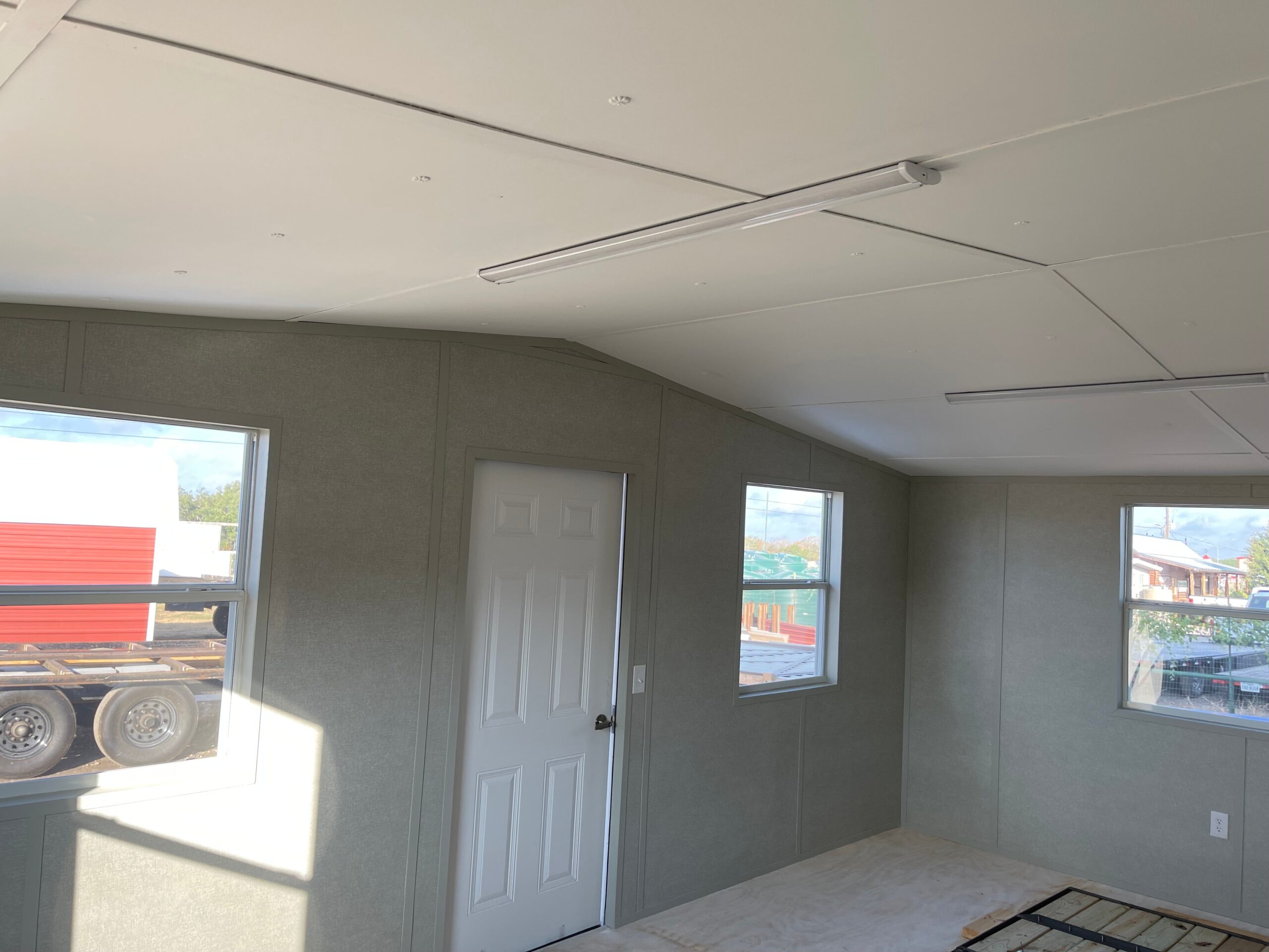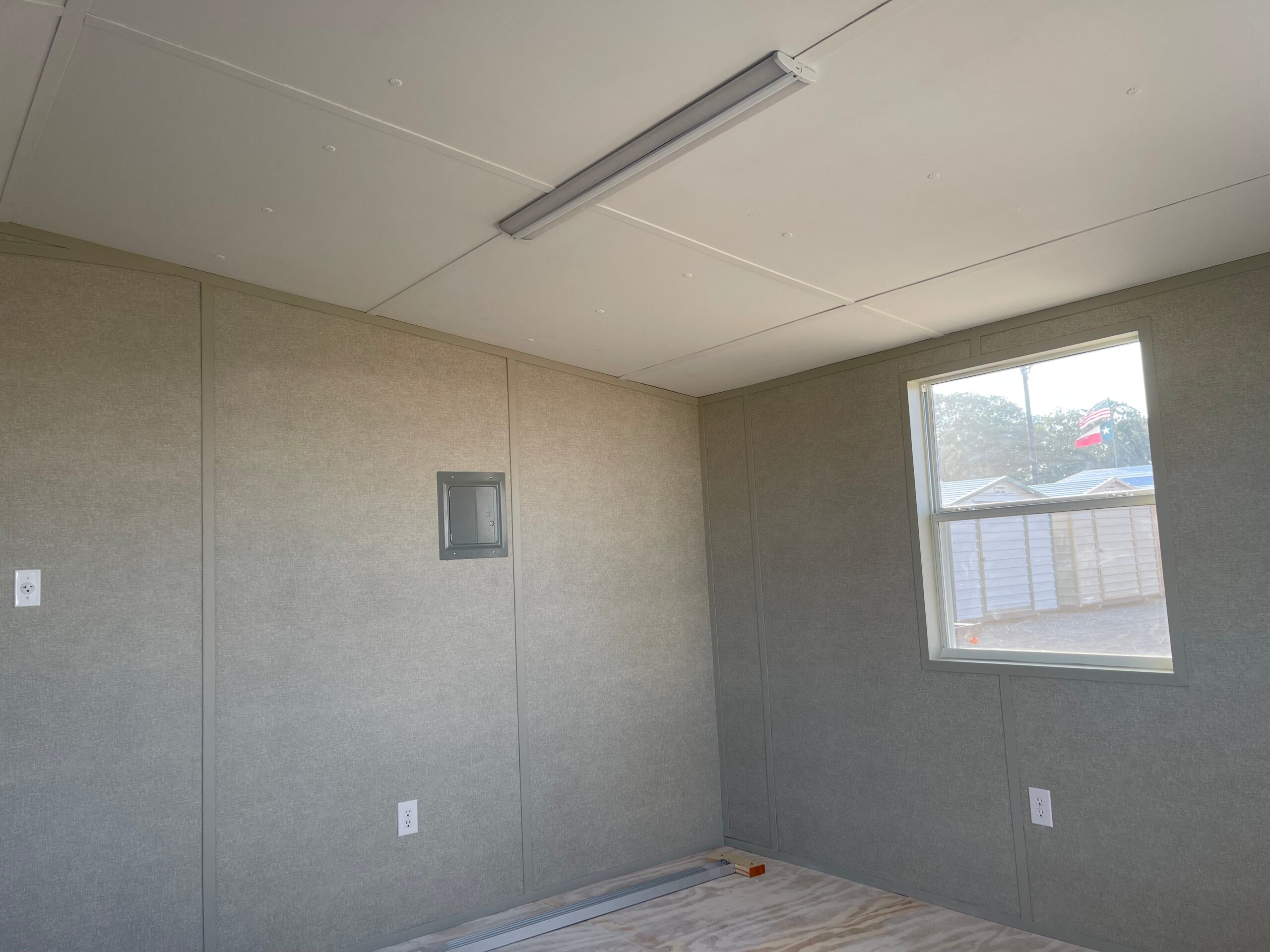 Finished on the inside, complete with electrical outlets, Clad steel door